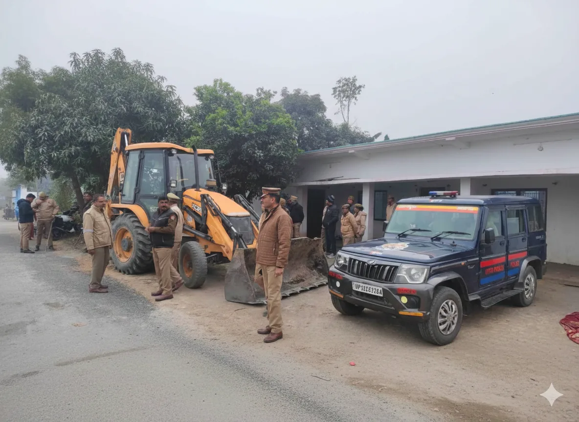 भारी पुलिस बल और बुलडोजर के साथ टीम हत्या के आरोपी रॉबिन सिंह के घर पहुंची।